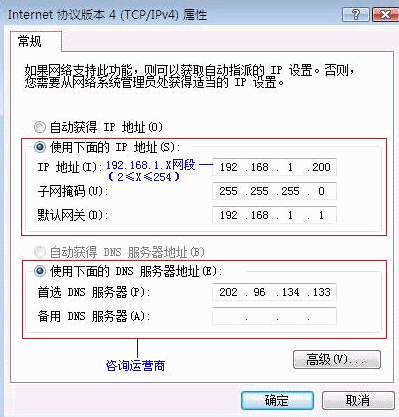 設置IP地址和路由器同一網段,DNS服務器地址請向網絡運營商咨詢。