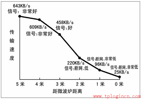 我們做了一個測試:用一臺電腦架設 FTP 服務器,有線連接 11Mbps 的 802.11b 無線 AP,然后,給另外一臺筆記本電腦裝上 802.11b 無線網卡,通過無線進行 FTP 下載。在正常情況下, 速度可以達到 655KB/s。 然后, 我們將這臺筆記本電腦逐漸靠近一臺正在工作著的 1000W功率的微波爐(功率設定位“中高火” ) ,觀察不同距離上的無線傳輸速度。從圖中我們可以看到,這臺功率并不太大的微波爐對無線網絡表現除了較強的殺傷力。當無線終端距4米以內時,它的影響力開始凸現;而當進入 2米范圍內,無線網絡的信號穩定程度已經開始受到挑戰,偶爾會出現斷網現象;當距離再靠近時,無線信號基本處于不可用狀態了。這也就是很多讀者反應的: “家里做飯菜時無線信號就不穩定”的主要原因。如果不巧無線基站布設在了微波爐周圍(單間寢室、一室一廳或單配房出現該情況的可能性較大) ,那么,這一影響將是無法彌補的(終端的位置還可以調整,基站位置就就不是可以隨意調整的咯)。
