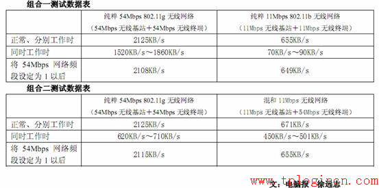 當兩個無線網絡同時進行FTP無線數據傳輸時,54Mbps的無線網絡速度降到了1520KB/s~1860KB/s,而 11Mbps 無線網絡的速度則大幅下降,僅有 70KB/s~90KB/s。