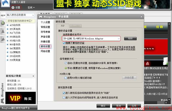 對(duì)戰(zhàn)平臺(tái)有很多,本例以盟區(qū)對(duì)戰(zhàn)平臺(tái)為例,首先進(jìn)入http://www.mengzone.com/網(wǎng)站,免費(fèi)注冊(cè)一個(gè)用戶名和昵稱,昵稱就是你在游戲中的名字。然后下載游戲平臺(tái)客戶端軟件,在本機(jī)上安裝好。打開桌面上的客戶端,輸入剛注冊(cè)的用戶名和密碼,然后選擇登錄服務(wù)器,確定后就進(jìn)入了游戲主界面,在首頁(yè)中點(diǎn)擊游戲設(shè)置,在接收設(shè)備設(shè)置上選擇我們安裝的無線網(wǎng)卡(TP-LINK TL-WN721N wireless Adapter)。如圖: